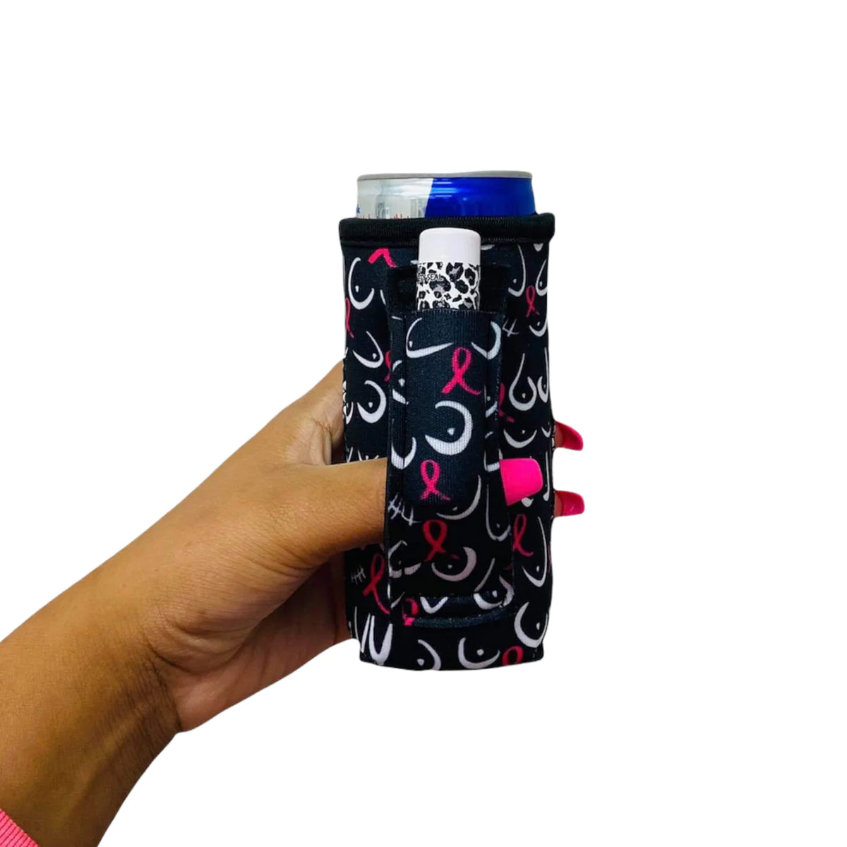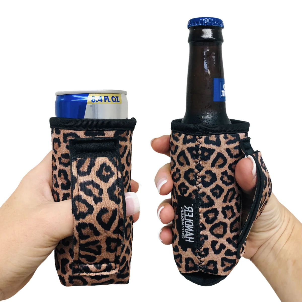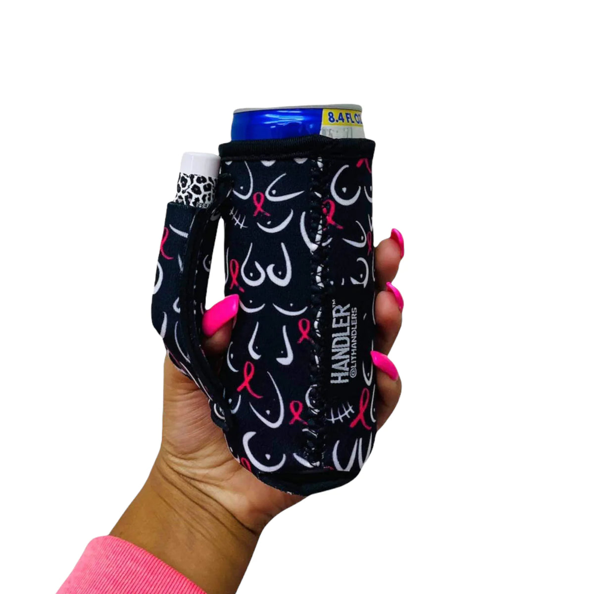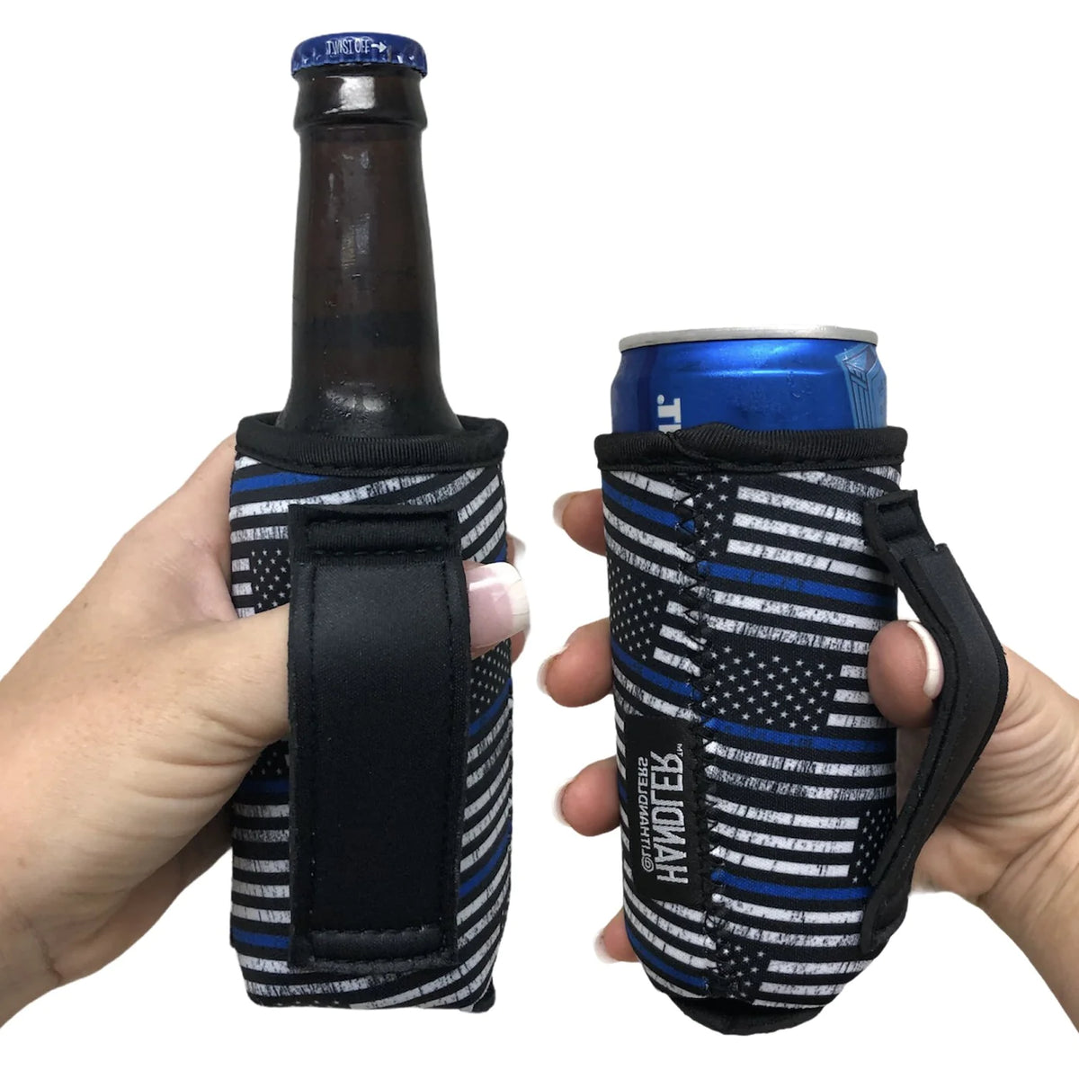 These cute, new, Handlers™  fit over the tall 8oz cans (smaller energy drink size), small 8oz wine cans and 10oz cans as well. And let’s not forget those bottles