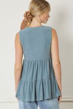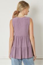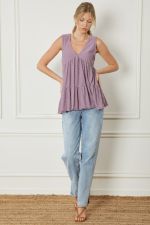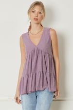 The Solid Swiss Dot Tiered Top is designed with a V-neck and sleeveless silhouette for optimal comfort. Crafted from a lightweight knit fabric, the top features a tiered structure and is unlined to maintain air flow and breathability. Non-sheer construction ensures a fluid, elegant look.