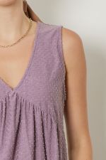 Solid swiss dot v-neck sleeveless tiered top. Unlined. Knit. Non-sheer. Lightweight.