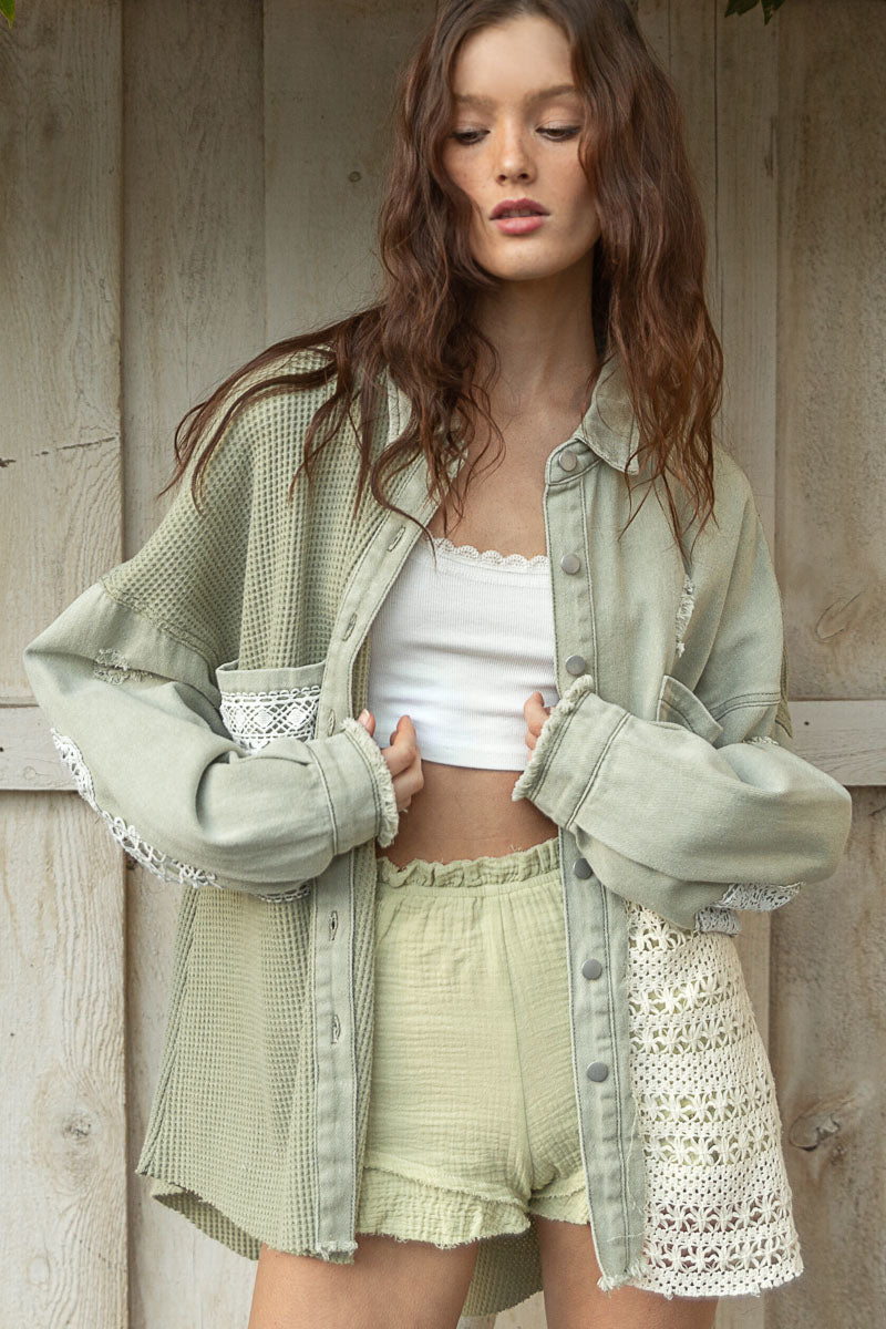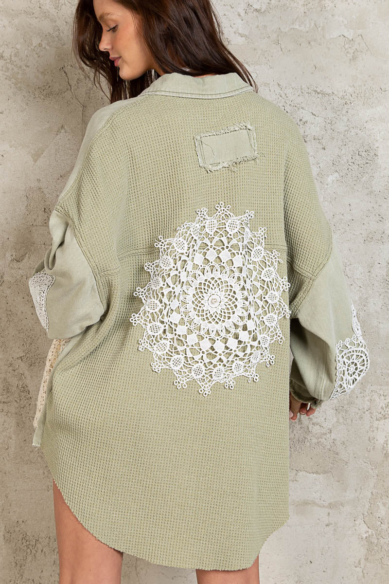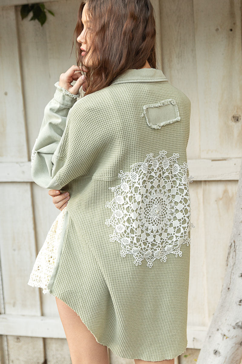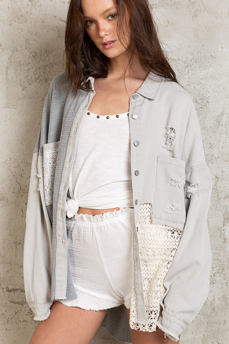 Designed in a shacket with patch detailing on the front and back and contrast fabric mixture detail
