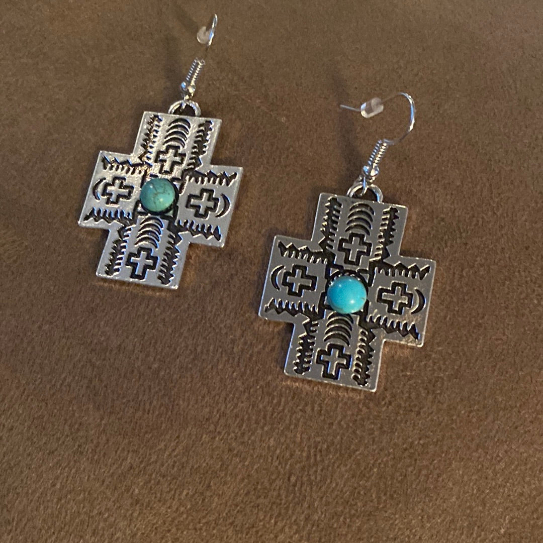 Beautiful cross earrings with carved out mini crosses in this beautifully detailed pair with just a bit of turquoise accent for a pop of color