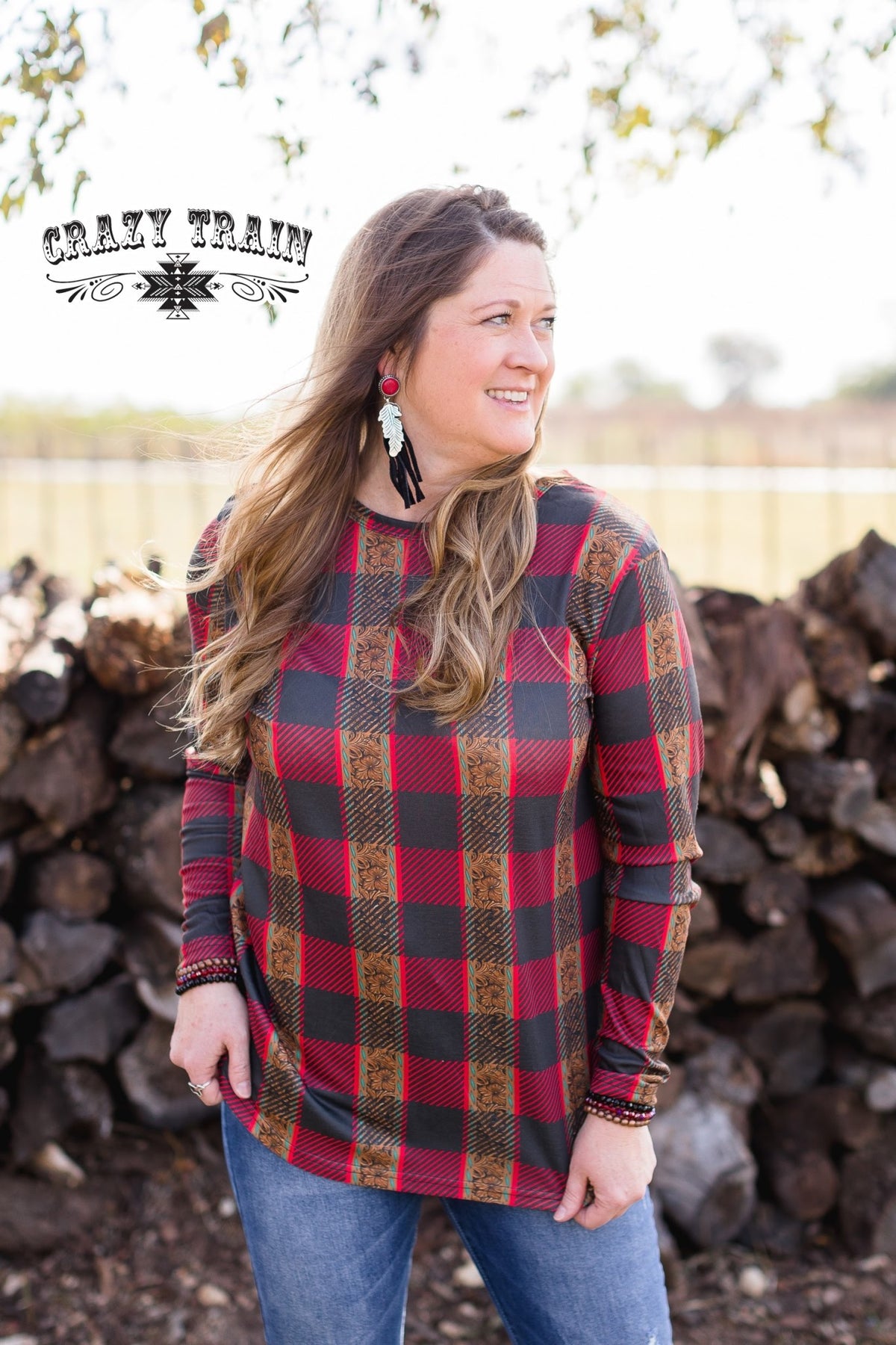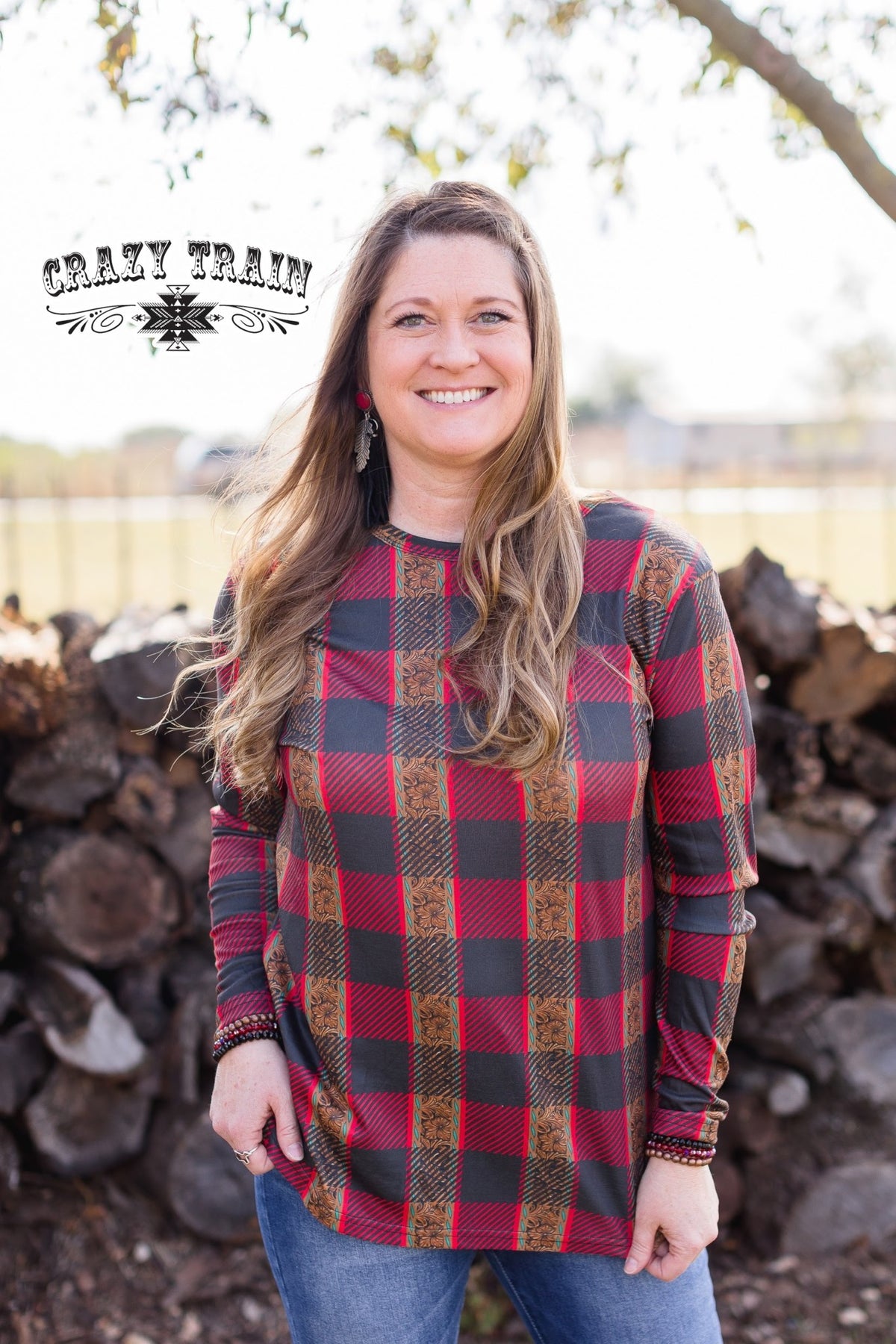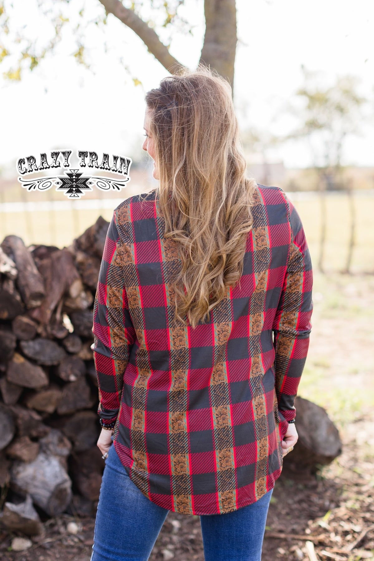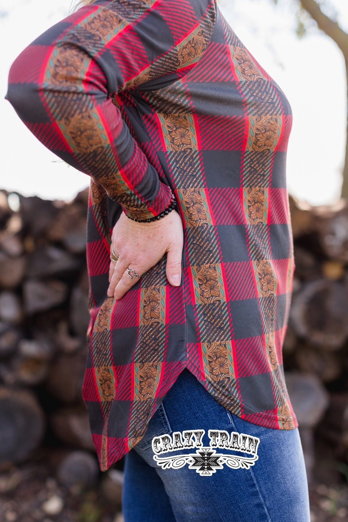 This soft material will feel great on you! has the teal accent running through tooled leather look plaid.